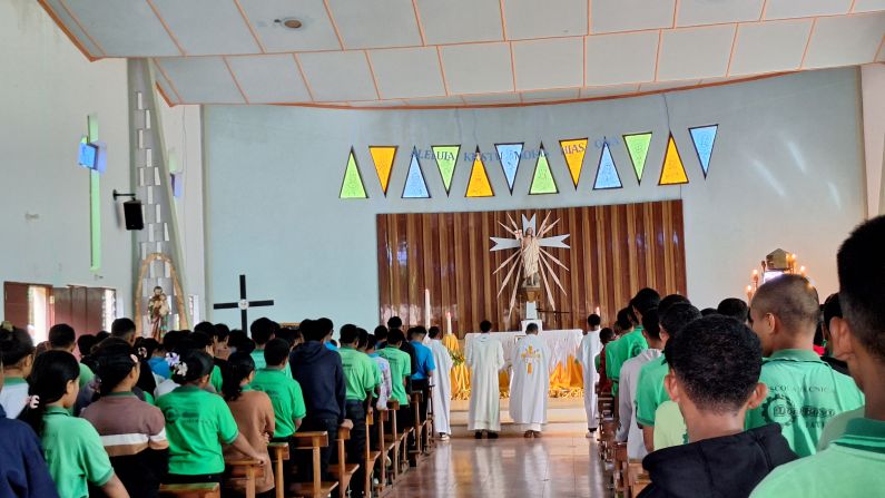 Salesianos, Formadores, Noviços, no estudantes reza ba Descanso Eterno Papa Francisco iha selebrasaun Eucaritica nebe prezide husi Pe. Isaias Bonifacio SDB, Rector Colegio Fatumaca, iha Santuario Nossa Senhora Auxiliadora Fatumaca.